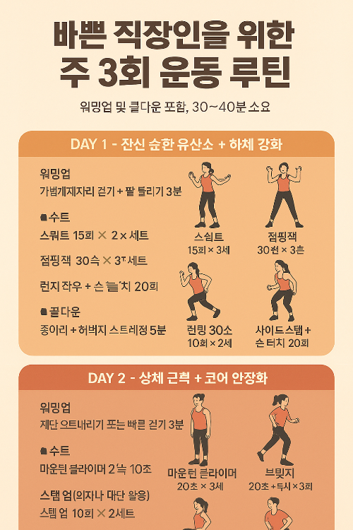 업무와 회의, 야근과 통근으로 하루가 금세 지나가는 직장인에게 ‘운동할 시간’은 가장 얻기 어려운 자원입니다. 그러나 건강은 하루아침에 무너지는 것이 아닌 만큼, 최소한의 투자로 최대한의 효과를 얻는 전략이 필요합니다. 주 3회, 하루 30~40분 정도의 시간을 확보하여 설계된 스마트한 운동 루틴은 체력 향상, 스트레스 완화, 만성 피로 해소에 충분한 효과를 줄 수 있습니다. 본 글에서는 주 3회, 무리 없이 따라할 수 있는 루틴을 유산소·근력·코어 중심으로 구성하여 바쁜 직장인의 현실에 맞춘 운동법을 제안합니다.