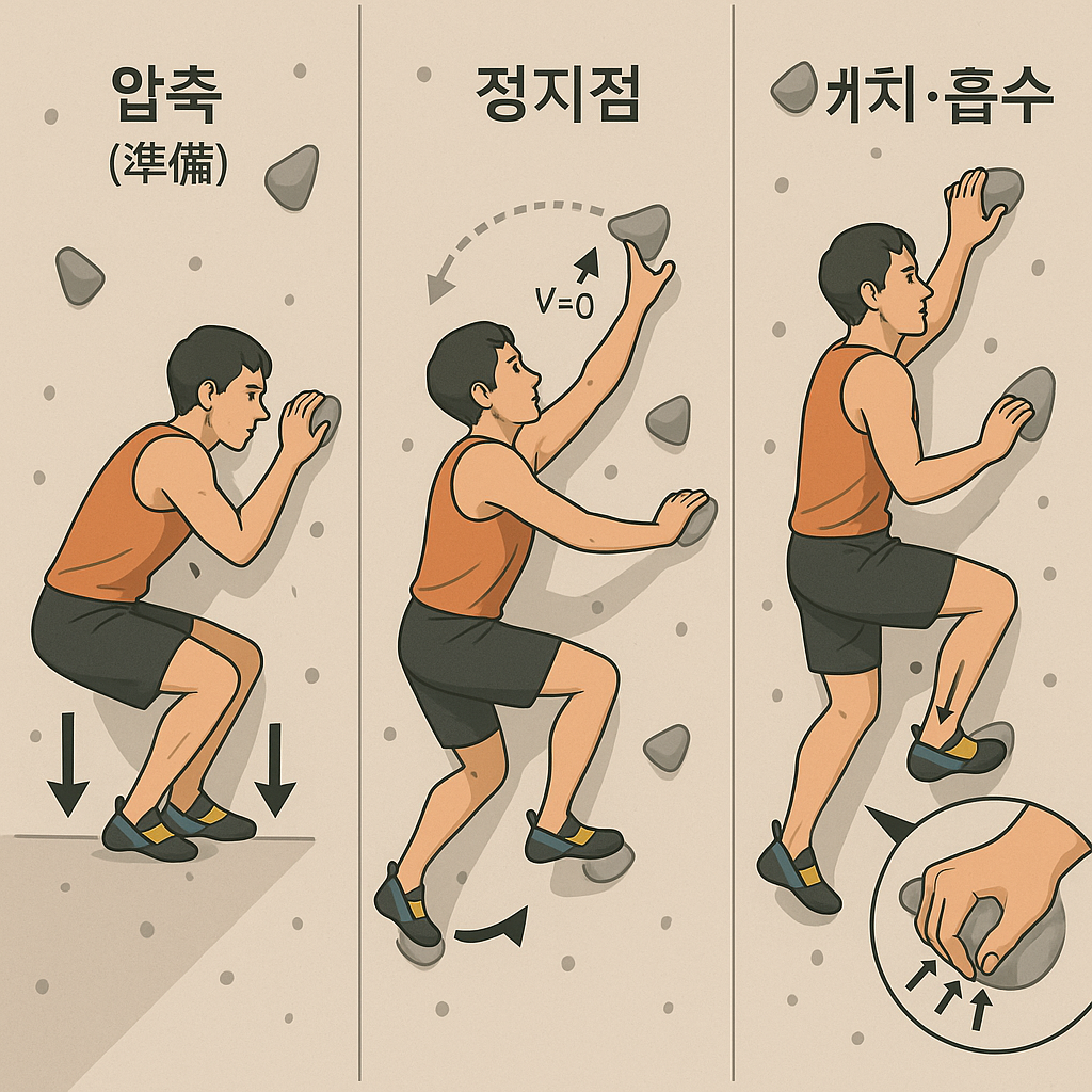 데드포인트는 정적으로 닿지 않는 홀드를 무중력의 정지 순간에 캐치하는 기술입니다. 하체 반동으로 추진력을 만들고, 정지점에서 손을 뻗어 충격을 흡수하며 안정화합니다. 아래 도해와 드릴로 오늘 당장 체화해 보십시오.