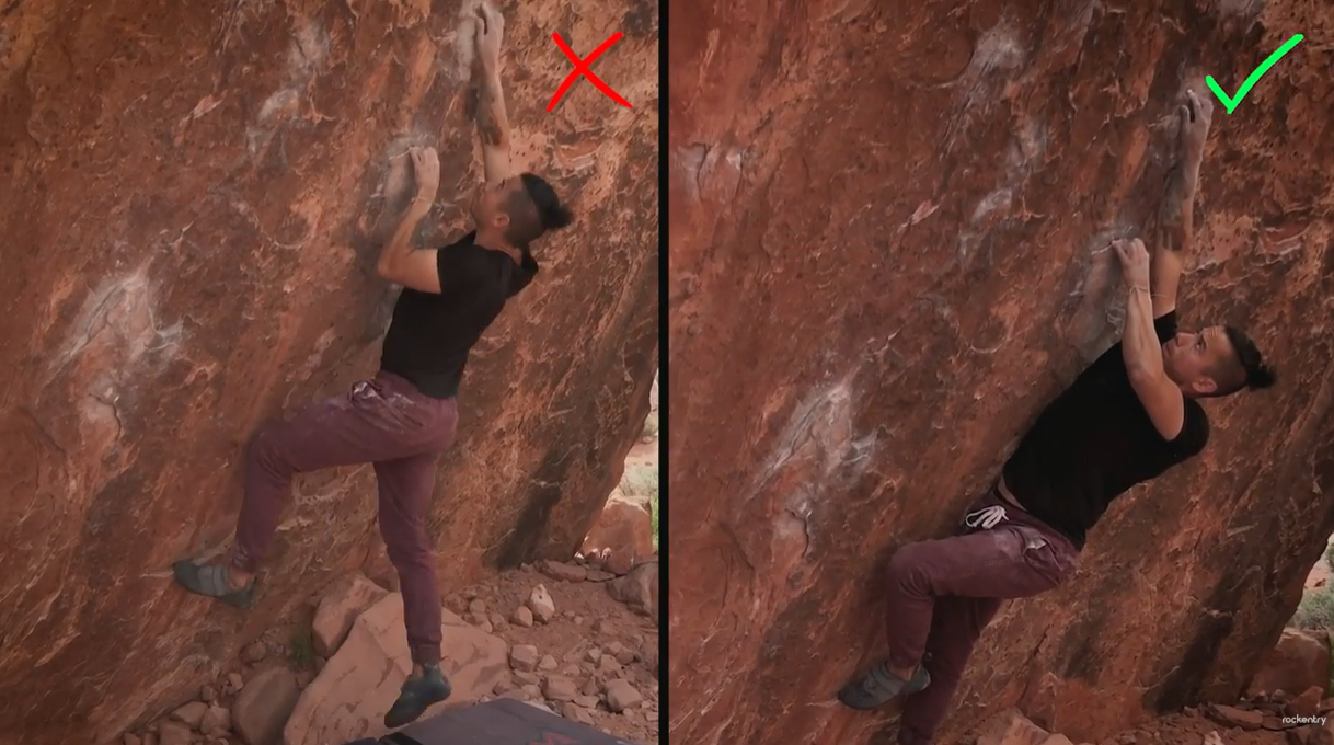 엉덩이를 바깥이 아닌 안쪽으로 집어넣고, 벽과 가까이 붙입니다. 이렇게 하면 체중을 발에 싣기 쉬워지고, 크림프에 가해지는 부하가 줄어들어요.