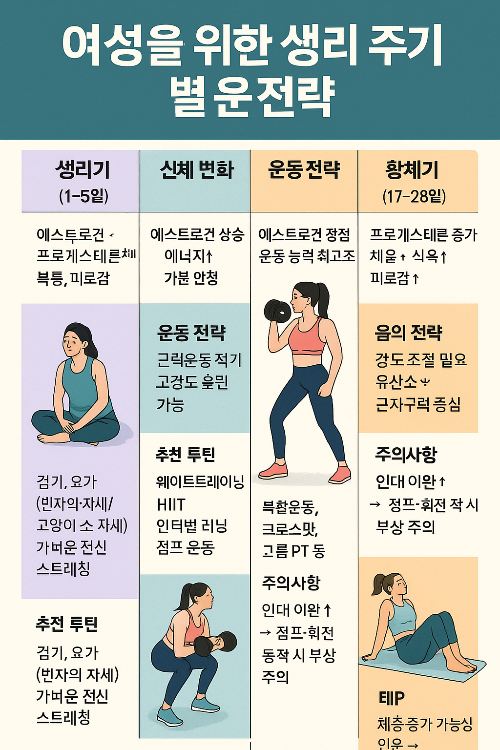 - 팁: 체중 증가 가능성 있음 → 수분 조절, 염분 관리 신경쓰기 이처럼 생리 주기에 따라 운동 강도와 종목을 조절하면, 몸에 무리를 주지 않으면서도 운동 성과는 더욱 향상될 수 있습니다. 자신에게 맞는 리듬을 찾는 것이 핵심입니다.