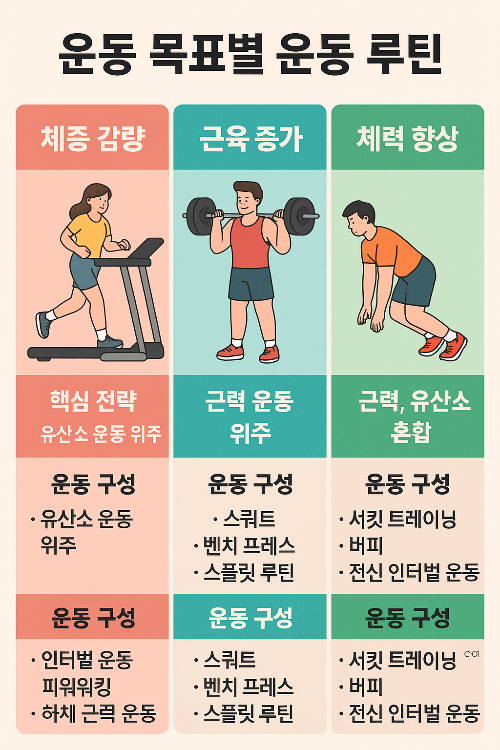 1. 체중 감량 루틴 - 핵심 전략: 칼로리 소모 > 칼로리 섭취. 유산소 + 근력 병행 - 운동 구성: - 유산소: 인터벌 러닝, 싸이클, 파워워킹 (주 4~5회, 30~45분) - 근력운동: 하체 중심(기초대사량 증가) + 전신 복합운동 (스쿼트, 런지, 플랭크 등) - 보조 전략: - 공복 유산소(주 2회), 식이조절(단백질 중심 식단), 주 1회 리커버리데이 - 루틴 예시: - 월/수/금: 유산소 40분 + 스쿼트/런지 - 화/목: 상체 + 복부 근력 루틴 - 토: 야외 유산소(등산, 산책) 2. 근육 증가 루틴 - 핵심 전략: 고중량·저반복 훈련 + 단백질 중심 식단 - **운동 구성: - 스플릿 루틴: 가슴/등/하체/어깨/팔로 나누어 부위별 고립 훈련 - 세트당 8~12회, 3~5세트 중심 - 주당 4~6회 훈련 + 1~2일 회복 - 보조 전략: - 운동 후 단백질 보충(30분 이내), 수면 7시간 이상, 점진적 과부하 적용 - 루틴 예시: - 월: 가슴 + 이두 / 화: 등 + 삼두 / 수: 하체 / 목: 휴식 - 금: 어깨 + 복부 / 토: 전신 보조 운동 / 일: 휴식 3. 체력 향상 루틴 - 핵심 전략: 근지구력 + 심폐지구력 균형 강화 - 운동 구성: - 서킷 트레이닝, 크로스핏, HIIT, 전신 인터벌 루틴 - 유산소와 근력의 혼합, 낮은 중량·높은 반복 - 주 3~5회, 1회당 40~60분 - 보조 전략: - 심박수 관리(목표심박수 60~80%), 3개월 주기 루틴 교체 - 루틴 예시: - 월/수/금: 전신 서킷 트레이닝 (버피, 푸시업, 마운틴클라이머 등) - 화/목: 인터벌 러닝 + 코어 중심 이처럼 각 목표에 따라 운동 구성뿐 아니라, 세트 수, 반복 수, 휴식 시간, 식단 전략까지 달라집니다. 루틴을 만들기 전 자신의 우선 목표를 명확히 하고, 그에 맞는 루틴을 설계하는 것이 첫걸음입니다.