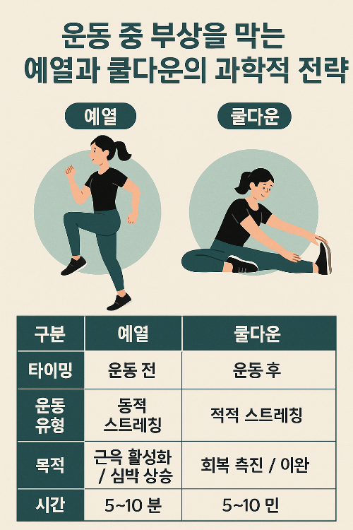 - 주의사항: 근육을 강하게 당기지 않고 편안한 자세 유지 3. 예열과 쿨다운 비교 요약