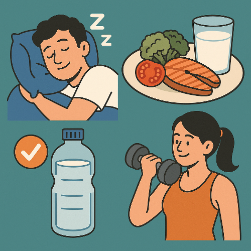 운동 효과를 극대화하기 위해서는 수면과 영양을 단순한 보조 수단이 아닌, 운동과 동등한 비중으로 인식해야 합니다. 아래는 수면과 영양 관리에서 핵심적으로 고려해야 할 사항입니다. 1. 운동을 위한 수면 전략- 하루 7~9시간의 숙면 확보: 성장 호르몬은 수면 초반 깊은 수면 단계에서 집중적으로 분비됩니다. 특히 밤 11시~새벽 2시는 회복 호르몬 분비가 절정에 이르는 시간입니다. - 수면 루틴 고정화: 매일 같은 시간에 자고 일어나는 습관이 생체 리듬을 안정시켜 수면의 질을 향상시킵니다. - 수면 유도 환경 조성: 잠들기 전 스마트폰, 알코올, 과도한 카페인 섭취는 피하고, 방은 어둡고 조용하게 유지합니다. - 운동 시간과 수면의 간격: 고강도 운동은 수면 최소 2시간 전까지 마쳐야 교감신경의 흥분이 수면을 방해하지 않습니다. 2. 운동 효과를 높이는 식사 구성- 운동 전 식사(1~2시간 전): 소화가 잘 되는 복합 탄수화물(고구마, 현미밥) + 소량의 단백질을 섭취하면 에너지원으로 활용됩니다. - 운동 후 식사(운동 직후 ~ 1시간 이내): 단백질 20~30g(계란, 닭가슴살, 단백질 쉐이크) + 탄수화물 소량을 함께 섭취하면 근육 회복과 글리코겐 보충에 도움이 됩니다. - 하루 전체 식사 균형: 단백질은 매끼 포함되도록 하고, 하루 총 섭취량은 체중 1kg당 1.5g을 기준으로 설정합니다. 지방은 불포화지방 위주로, 당분은 최소화합니다. 3. 수분과 회복 관리 - 수분 섭취는 근육 수축과 체온 조절에 필수적입니다. 운동 중과 후에도 충분한 물을 마셔 탈수를 예방해야 하며, 수분 부족은 피로 증가와 회복 지연을 초래할 수 있습니다. - 운동 후 스트레칭과 수면 직전 명상 또는 이완 호흡은 신경계 회복에 도움을 줍니다. 수면과 식사 관리가 제대로 이뤄진다면 운동 효율은 최소 30% 이상 향상될 수 있으며, 운동 효과가 ‘누적되고 축적되는 과정’임을 감안할 때, 장기적인 건강 관리를 위해 반드시 함께 설계해야 할 요소입니다.
