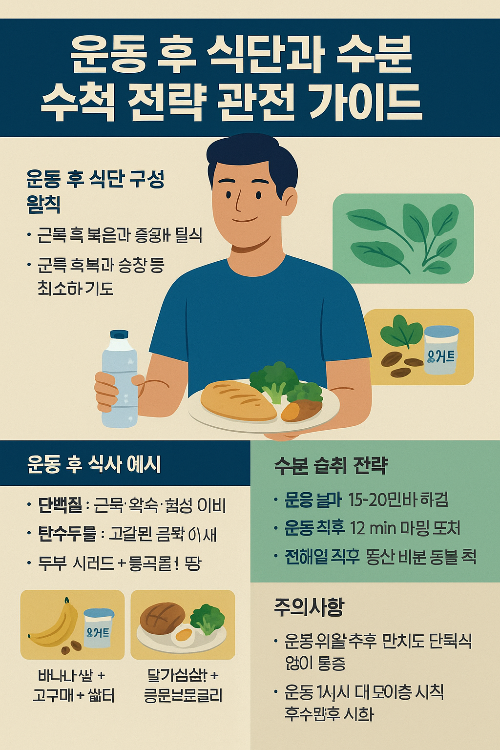 운동의 효과는 운동 자체로만 결정되지 않습니다. 근육이 실제로 성장하고 회복되는 시간은 운동 후이며, 이때 어떤 음식을 먹고, 얼마나 수분을 섭취하느냐에 따라 회복 속도와 컨디션이 크게 달라집니다. 특히 운동 후 골든타임으로 알려진 30~60분 안에 적절한 단백질과 탄수화물을 공급하면 근육 손상을 최소화하고 에너지 회복을 돕습니다. 이 글에서는 운동 직후부터 다음 식사까지 어떤 식단이 가장 효과적인지, 수분은 얼마나 어떻게 보충해야 하는지를 과학적으로 설명하고, 실천 가능한 식단 예시까지 함께 제시합니다. 효과적인 회복이 곧 더 나은 운동 성과로 이어지는 법, 지금부터 알아보세요.