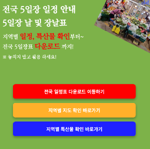 ▶ 전국 5일장 장날표 (일정,위치,특산물) 바로가기 ◀