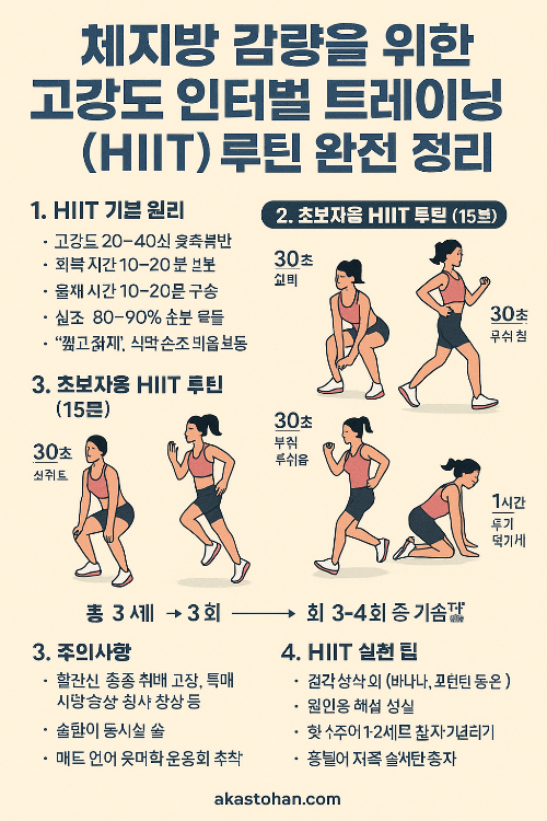 시간이 부족한 현대인을 위한 체지방 감량 최고의 솔루션, HIIT! 고강도 인터벌 트레이닝은 짧은 시간 안에 최대한의 칼로리를 소모하고, 운동 후에도 높은 대사 상태를 유지시켜주는 과학적으로 검증된 체지방 감량 전략입니다. 이 글에서는 초보자도 실천 가능한 HIIT 기본 구성 원리와 대표 루틴, 주의사항, 체지방 감량 효과를 극대화하는 실전 팁까지 모두 정리하였습니다. 매일 15분, 땀을 쏟을 준비가 되었다면 지금 시작해보세요!
