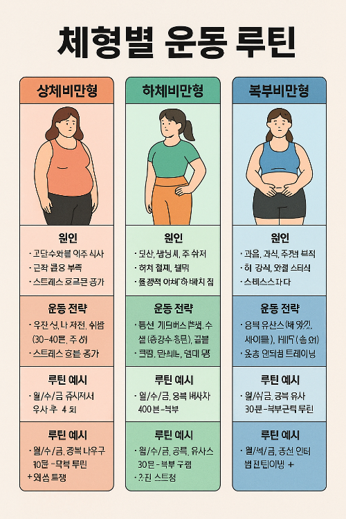 다음은 대표적인 체형별 운동 루틴 구성과 설명입니다. 각 체형의 특성을 반영하여 유산소, 근력운동, 스트레칭의 균형 있는 조합을 제안합니다. 1. 상체비만형 (어깨·등·팔에 지방 집중) - 원인: 고탄수화물 위주의 식사, 근력 운동 부족, 스트레스 호르몬 증가 - 운동 전략 - 유산소: 빠른 걷기, 실내 자전거, 수영(30~40분, 주 4~5회) - 근력운동: 푸시업, 암 컬, 레터럴 레이즈 등 상체 집중 근력 운동 - 루틴 예시: - 월/수/금: 유산소 30분 + 어깨/팔 근력 20분 - 화/목: 하체 코어 위주 근력 + 전신 스트레칭 2. 하체비만형 (엉덩이·허벅지 중심 지방 축적) - 원인**: 좌식 생활, 림프 정체, 하지 혈류 부족, 유전적 하체 비만 체질 - 운동 전략: - 유산소: 등산, 계단 오르기, 스텝박스 운동(하체 순환 촉진) - 근력운동: 스쿼트, 런지, 힙 브릿지, 클램셸(중강도, 반복 중심) - 루틴 예시: - 월/수/금: 유산소 40분 + 힙업 루틴 - 화/목: 하체 스트레칭 + 고관절 강화 운동 3. 복부비만형 (내장지방 및 복부 군살 중심) - 원인: 과음, 과식, 수면 부족, 고탄식, 스트레스 과다 - 운동 전략: - 유산소: 공복 유산소(빠른 걷기, 싸이클 등), HIIT(주 3회) - 근력운동: 크런치, 플랭크, 레그레이즈, 마운틴클라이머 등 복부 강화 중심 - 루틴 예시: - 월/수/금: 공복 유산소 30분 + 복부 근력 루틴 - 화/목: 전신 인터벌 트레이닝 + 복부 스트레칭 체형별 운동 루틴을 실천할 때 중요한 것은 ‘균형’입니다. 특정 부위를 집중적으로 운동하더라도 전신 근육의 균형을 무너뜨리면 부상이나 체형 왜곡이 올 수 있습니다. 따라서 1~2일은 전신 운동이나 요가, 필라테스 등으로 균형감을 유지하는 날을 포함시키는 것이 좋습니다.