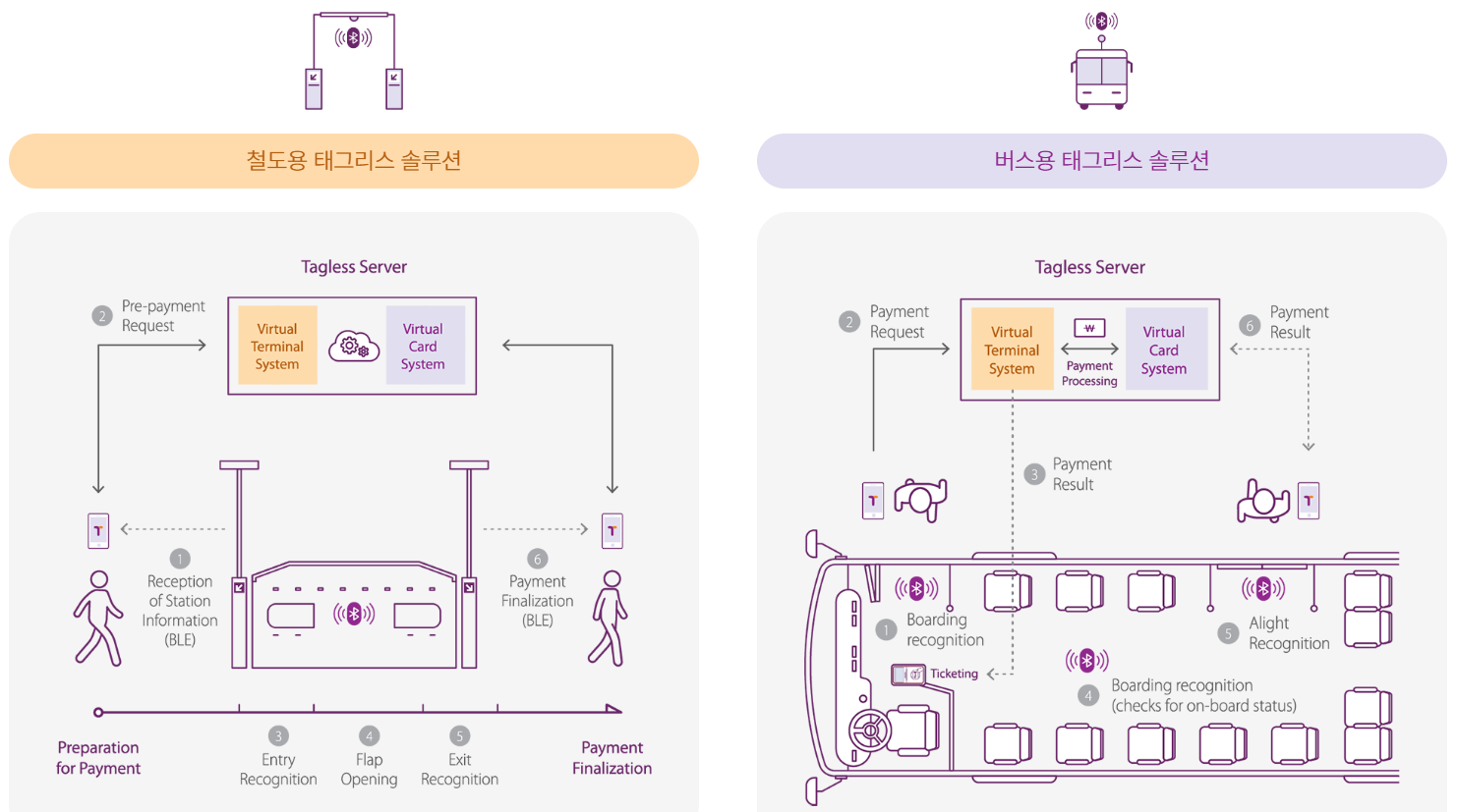 | 정의 | BLE 기반 센서와 서버 기술로 승하차 시 자동 결제되는 태그리스 방식 |