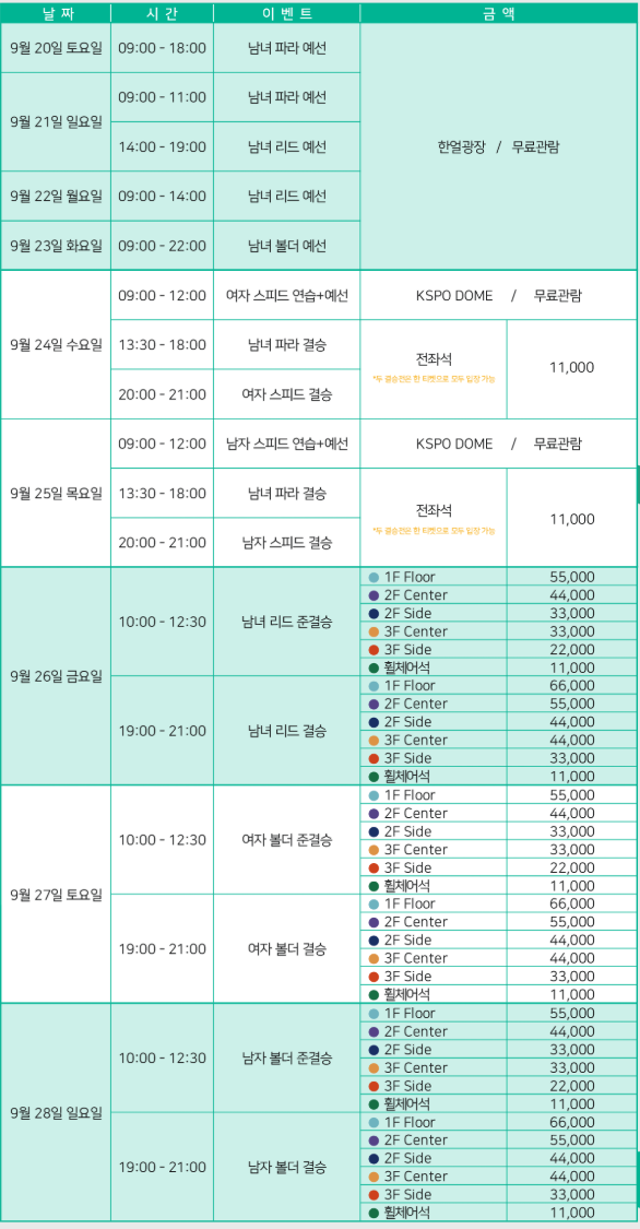 - 9/24: 여자 스피드 예선 & 결승, 파라클라이밍 결승